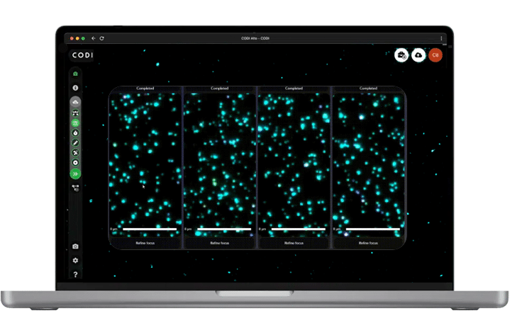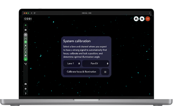 The system facilitates a rapid assessment of key features within minutes including the density of EVs in the sample, their distribution and the efficacy of biomarker staining. This step ensures the quality and the reliability of the sample before the full imaging process. If necessary, users have the option to modify the autofocus settings on a per-lane basis, based on the insights they gained from the images. This adaptive approach allows for fine-tuning and optimization in real-time, ultimately contributing to the accuracy and the precision of the imaging results.