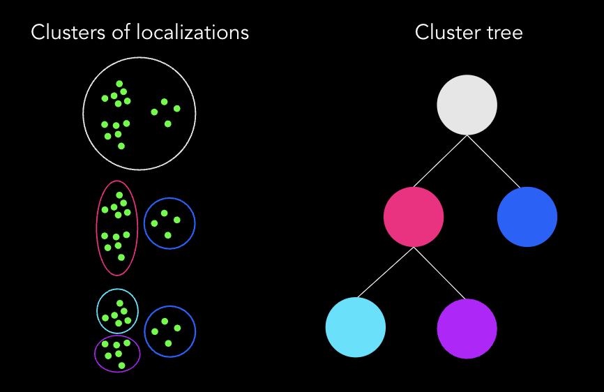 There are many popular algorithms, but most approaches rely on some metric of density. In general localizations that are densely packed form clusters, and these clusters are separated by areas of sparse localizations. In practice, however, this is a complicated problem. For example, due to the varying background across a sample or because some clusters themselves contain smaller clusters.