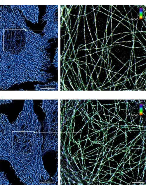 In this figure we present dSTORM images of tubulin labelled with AF647 in HaCaT cell, acquired inside the safety cabinet (A) on a lab bench (B). In the right panels, individual localizations have been colored according to the frame of their appearance (1-20000 frames). The figure demonstrates an extremely low level of sample drift considering the acquisition of data over tens of thousands of frames.