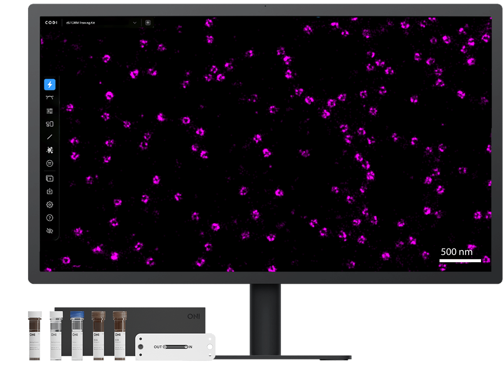 The ONI Discovery Kit™ for dSTORM imaging provides a modular workflow for immunofluorescent labeling in cultured cells, which allows you to confidently detect extra and intracellular proteins in two channels with 20 nm resolution and high sensitivity in your own samples.* You provide the cells and custom antibodies, we provide the rest!