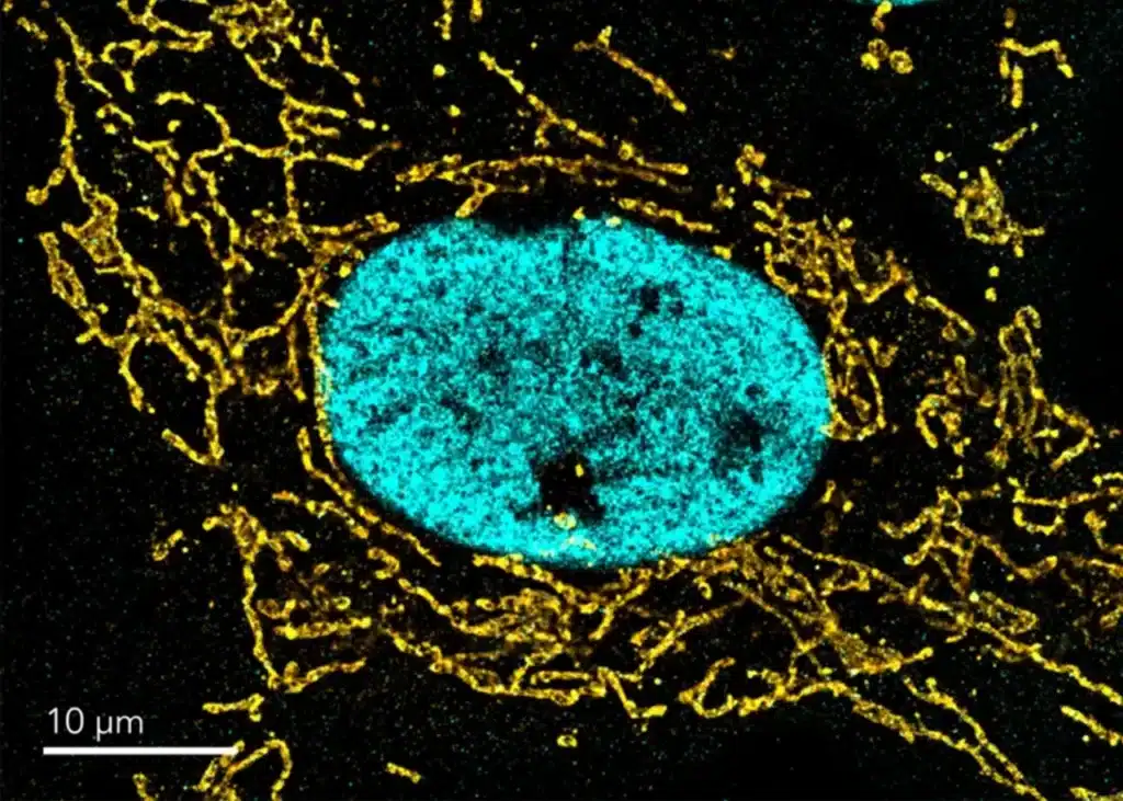 Histone H3K27ac (cyan) and mitochondria TOMM20 (gold) labeled with anti-rabbit CF583R and anti-mouse AF647 in U2OS cells.