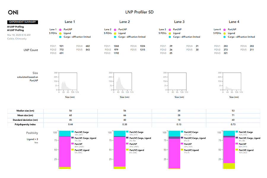 ONI’s LNP characterization service provides comprehensive analysis of LNP populations, delivering actionable data to guide faster, more informed decisions. The service correlates multiple metrics, including the fraction of cargo-positive LNPs, surface ligand abundance, cargo levels per lane (measured in photon counts from diffraction-limited imaging), and ligand abundance per particle (number of localizations per LNP). It also evaluates LNP size distribution as a function of both cargo loading and positivity.