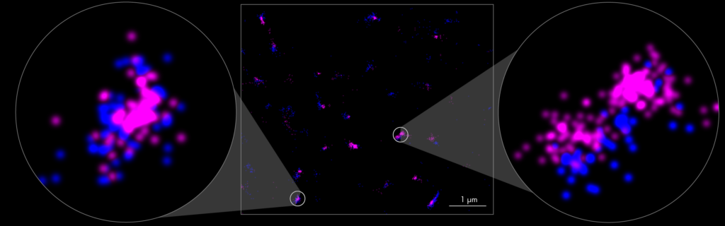 Figure 6. Whole mouse brain tissue labeled with two fluorophores to evaluate in vivo labeling efficiency. PALM image of a 6µm-thick brain tissue section of a PSD95-mEos2/PSD95-Halo mouse (blue and magenta, respectively) labeled with HaloTag-PA Janelia Fluor® 646 dye. Two color PALM imaging was used to assess the labeling efficiency of postsynaptic protein using Halo tag in vivo (zoomed in regions). Sample prepared by Edita Bulovaite (Seth Grant’s group) Centre for Clinical Brain Sciences, University of Edinburgh, UK.