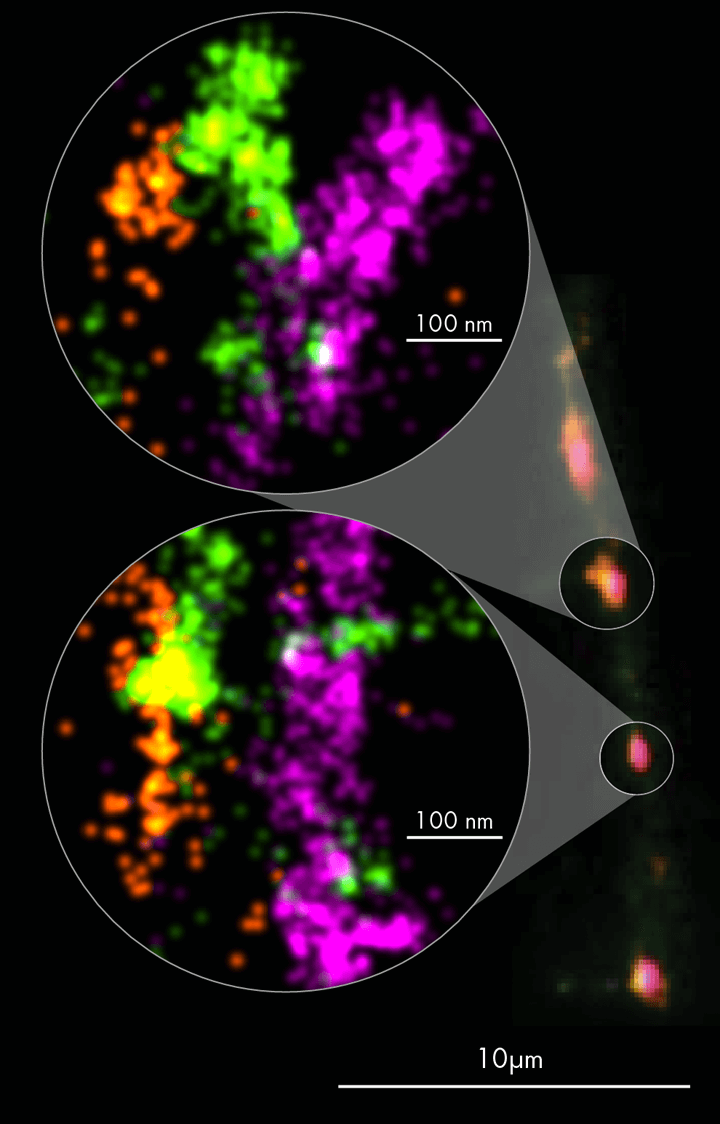 Figure 2. Rat primary cortical neurons were cultured for 14 days, allowing synapse formation on a dish. Neuronal synapses were visualized in 3 color dSTORM imaging using two presynaptic proteins Bassoon (in magenta) and VGluT1 (in green); and the postsynaptic protein Homer1 (in orange). Image credit: ONI Applications Development Team.
