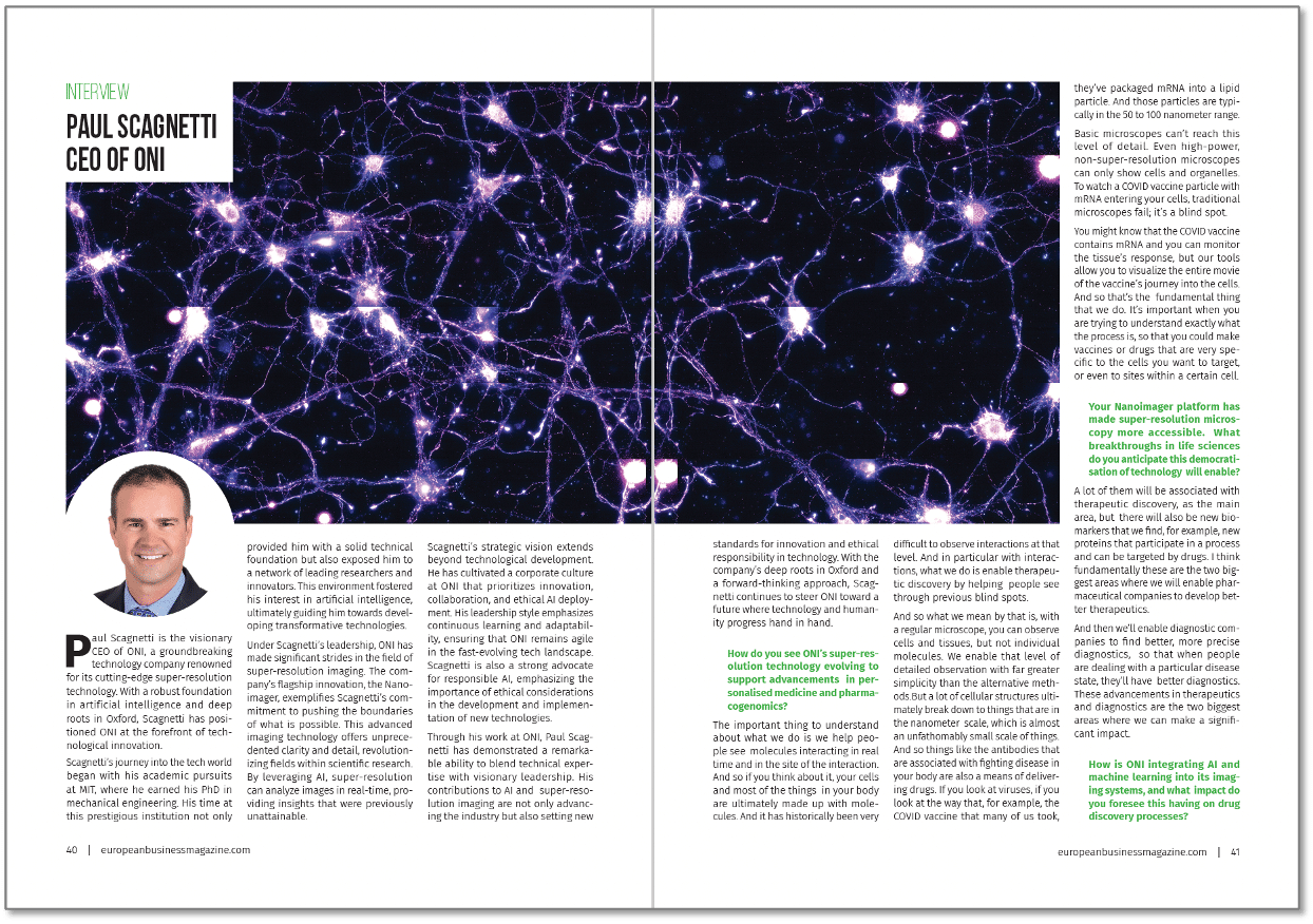 In a recent feature, European Business Magazine spotlighted ONI as a rising disruptor in the life sciences industry. Dr. Paul Scagnetti, CEO of ONI, shared his insights on the transformative potential of ONI’s super-resolution technology, its role in advancing personalized medicine, and the company’s vision for the future.