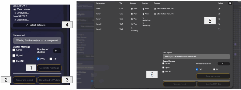 - Manual FOV Selection: FOVs to be imaged can be selected by clicking the squares in each lane, and removed by hovering over the FOV and clicking the x.