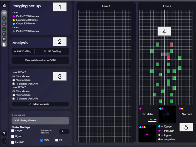To obtain insights into the LNP sample, data acquired on AutoLNP has to be analyzed on ONI’s cloud-based software, CODI. The raw imaging data is first saved locally on the C drive on the Aplo Scope laptop and is then uploaded to CODI. Upload is automatic, but it requires a stable internet connection and for CSA to be open.
