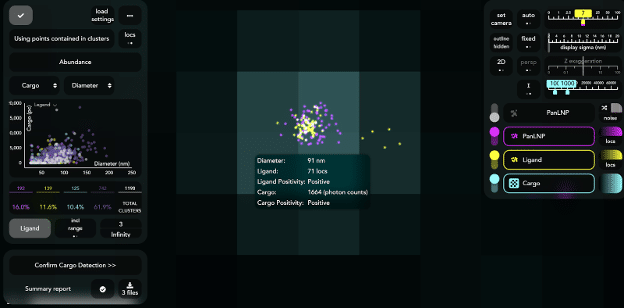 Once laser powers are optimized, the beads slide will be scanned in (X,Y) to ensure appropriate sampling of the entire field of view to create an accurate mapping between channels. During channel mapping, for each FOV, 10 frames are acquired with 100 ms exposure time until at least 1000 points pairs (PanLNP-Ligand; PanLNP-Cargo; Cargo-Ligand) are found. For each pair of channels, only points that are stable across 10 frames and consistently match the respective point in the other channel are kept. These pairs of points are used to create a mapping transform which is used to ensure that all data is aligned with nanometer precision.