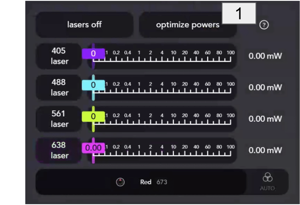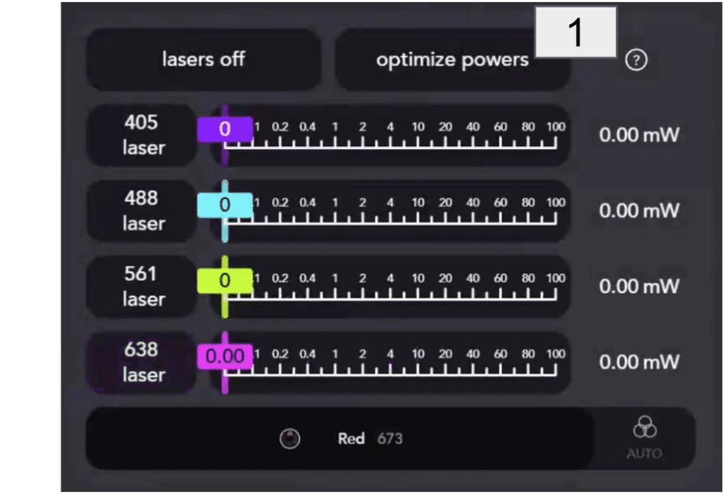 - Click the “Set laser powers” button, which will now indicate the active laser wavelength and power. This will save the currently active laser power to be used for all lanes of the current experiment.