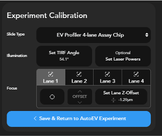 The “Save & Return to Experiment” button will be enabled once the TIRF angle and the z-offset for all 4 lanes have been set. This button must be clicked for the AutoLNP experiment to use manual calibration.
