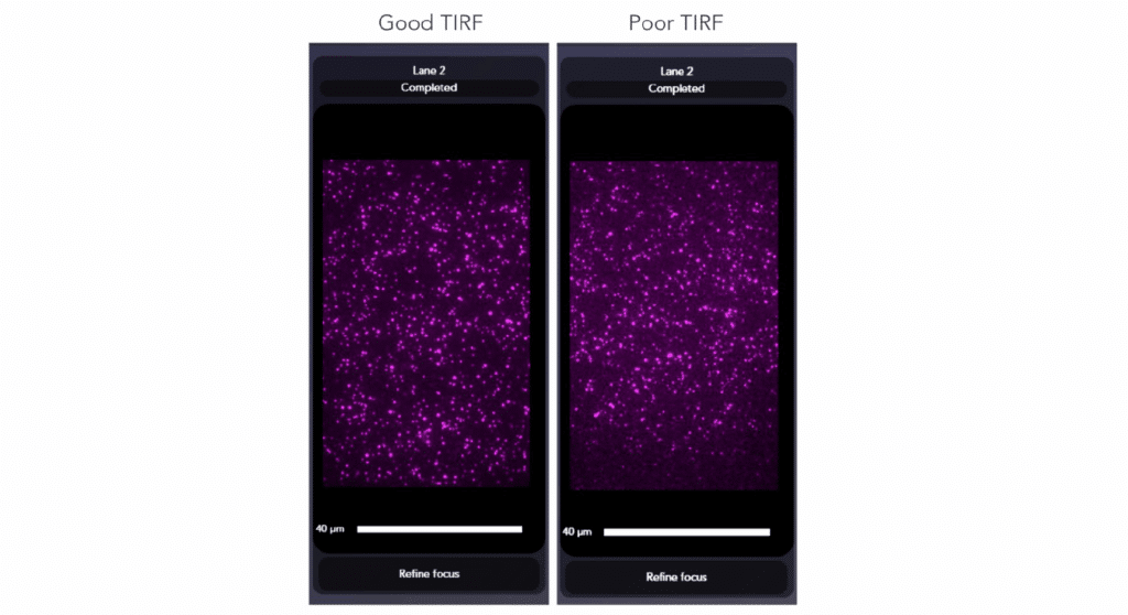 - AutoTIRF automatically finds the optimal illumination angle for LNP imaging by maximizing the signal to noise ratio of the spots with respect to the background. The optimal TIRF angle is determined during the “System Calibration” step, using the selected lane and channel. At any time, the TIRF angle can be manually input in the System Info app. See the “Check TIRF angle” sub-section under the “Calibration & Sample Check” section to select the optimal TIRF angle.