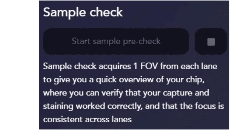 Sample pre-check is a great tool that quickly scans each Assay Chip lane and provides a representative image of the sample. It is recommended to use it for each Assay Chip to get an overview of the sample prior to imaging. This will help confirm correct sample calibration, focus and illumination; and if LNP densities are as expected, LNPs were correctly stained, and samples properly washed.