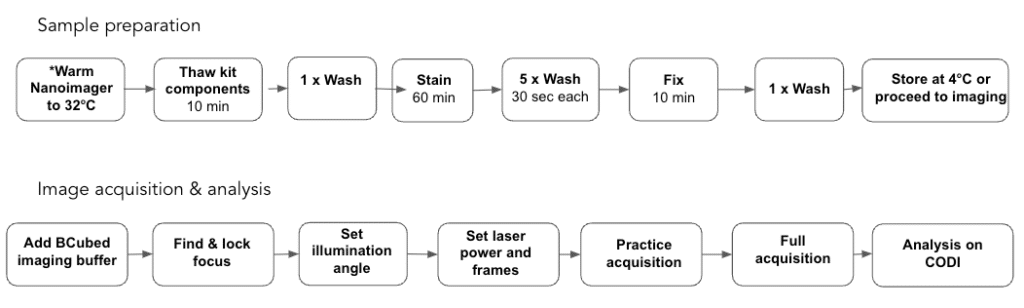 Important note: if imaging on the same day as sample preparation, begin warming the Nanoimager to 32ºC before beginning with step 1, for at least 60 minutes prior to imaging. Refer to the Sample Preparation training video for additional support: