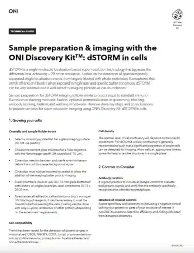 Since its invention in 2006, STORM microscopy has become the most widely used super-resolution microscopy technique for single-molecule imaging. STORM stands for “Stochastic Optical Reconstruction Microscopy” and it relies on the stochastic activation of individual fluorophores with photoactivatable properties. STORM is compatible with fixed cells and fixed particles and requires specific antibodies. It can generate images of molecular structures resolved to under 20 nm.